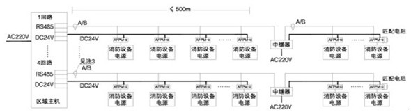傳輸距離大于500m時(shí),需加中繼器,1合中繼器占用1個(gè)傳感器(監(jiān)控模塊)地址,中繼器的AC220V電源線采用3*1.5mm^2,由現(xiàn)場(chǎng)消防電源或消防監(jiān)控室監(jiān)控器(主機(jī))提供。