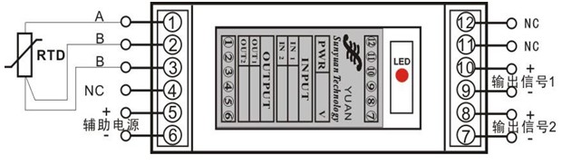 應用方案舉例2:一路熱電阻信號輸入,兩路電流信號輸出。