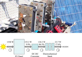 據報道,由美國電力天然氣公共服務公司慷慨提供的在整個州電力高壓線桿頂上的商業太陽能電池板,其產生的能量可將二氧化碳和水轉換成甲酸。這一過程發生在一個電化學的電池里,包含長方形午餐盒大小的金屬板封裝可以輸送液體的通道。