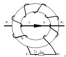 低壓電流互感器的工作原理如圖1所示,電流互感器的一次繞組串聯在被測線路中,I1為線路電流即電流互感器的一次電流,N1為電流互感器的一次匝數,I2電流互感器二次電流(通常為5A、1A),N2為電流互感器的二次匝數,Z2e為二次回路設備及連接導線阻抗。當一次電流從電流互感器P1端流進,P2端出,在二次Z2e接通的情況下,由電磁感應原理,電流互感器二次繞組有電流I2從S1流過,經Z2e至S2,形成閉合回路。由此可得電流在理想狀態下I1×N1=I2×N2,所以有I1/I2=N1/N2=K,K為電流互感器的變比。