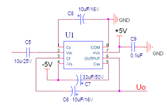 真有效值轉換電路實現電路中AC/DC真有效值轉換,將輸入的交流信號通過真有效值芯片轉化為真有效值的直流電壓,能夠精確測量各種電壓波形的有效值,而不必考慮被測波形的參數以及失真。如圖2所示:電路中,Ui信號經過電容C5隔直后輸入到真有效值芯片中,其中電容C8,C9的作用是濾掉該電路中的高頻干擾,采用雙電源工作方式,滿足真有效值的工作要求。