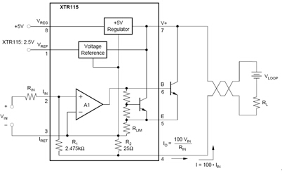 信號輸出電路主要采用TI公司生產的精密電流變送芯片XTR115,其具有精度高,芯片功耗小以及非線性誤差小等優點,內部產生2.5V基準電壓,且內部帶有+5V的精密穩壓器,可以給外部電路(例如電路中的放大器)單獨供電,從而簡化了外部電源的設計,如圖3所示電路。