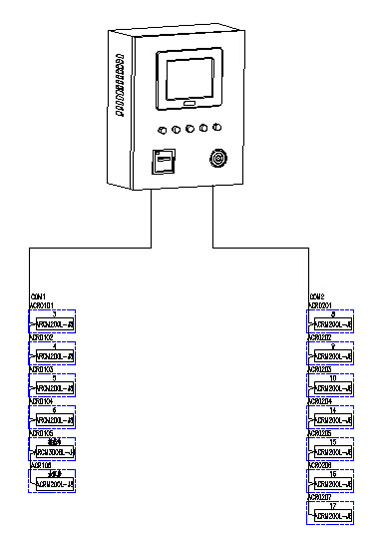 本項目通訊總線共接入二條通訊總線,總線在配電室手拉手串接后,接入壁掛式后臺,組成電氣火災系統的大動脈。箱體中漏電流互感器通過電流線接入漏電探測器,漏電探測器實時顯示漏電情況。以上所述組成一套信號穩定,精度可靠的電氣火災監測系統。本系統組網共分為三層: