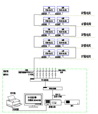 管理系統主要實現羅店鎮市民服務中心樓層配電箱實時用電監測與電能管理。監控范圍為8層樓內的10只多功能儀表。現場多功能儀表通過一條總線接入值班室采集器,再將通過采集器連接到監控主機,從而在監控主機上實現總線上儀表與監控主機的數據連通。如下圖所示:站控管理層、網絡通訊層和現場設備層。