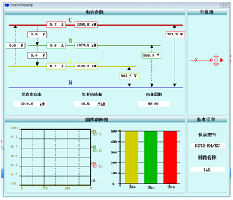電壓、電流、功率、功率因數及頻率等監測信息實時刷新,并以一次圖形式直觀動態顯示。各回路子畫面上顯示該回路各電參量、回路名稱、電流越限值等信息。