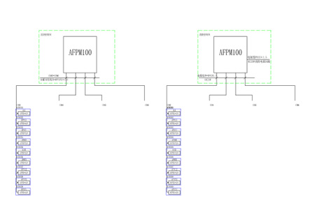 南禪寺地鐵上蓋物業項目消防設備電源監控系統采用消防設備電源狀態監控器+電壓傳感器的二層結構組網模式。根據項目實際要求,為該項目配置消防設備電源監控系統的電壓傳感器型號為:AFPM3-2AV,消防設備電源狀態監控器型號為:AFPM100/B;AFPM100/B設置在消防控制室內,引出1根RS485總線及DC24V電源線與現場配電箱內的傳感器相連。系統拓撲結構如下圖: