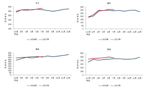 1-7月份,化學原料制品、非金屬礦物制品、黑色金屬冶煉和有色金屬冶煉四大高載能行業用電量合計10381億千瓦時,同比增長6.0%,增速比上年同期提高8.7個百分點;合計用電量占全社會用電量的比重為29.2%,對全社會用電量增長的貢獻率為25.5%。其中,化工行業用電量2554億千瓦時,同比增長3.5%,增速比上年同期提高0.1個百分點;建材行業用電量1807億千瓦時,同比增長4.0%,增速比上年同期提高3.9個百分點;黑色金屬冶煉行業用電量2774億千瓦時,同比增長2.4%,增速比上年同期提高11.0個百分點;有色金屬冶煉行業3246億千瓦時,同比增長12.7%,增速比上年同期提高16.1個百分點。