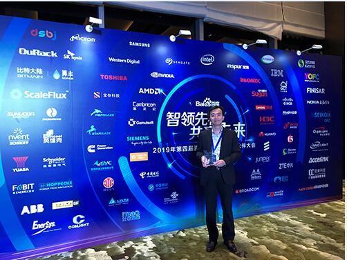 臺達(dá)資通訊電源方案事業(yè)部中國區(qū)銷售部總經(jīng)理李政興先生,獲獎后持獎杯在大會宣傳板前留影