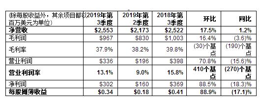 營業利潤:總計3.36億美元,同比下降15.6%,去年同期為3.98億美元。公司的營業利潤率同比增長270個基點,占凈營收的13.1%,而2018年第三季度為15.8%。