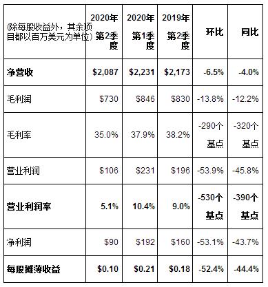 毛利潤總計7.30億美元,同比下降12.2%。毛利率35.0%,同比下降320基點,主因是閑置產能支出,新冠肺炎疫情期間勞動力限制措施對生產的影響,以及價格壓力。第二季度毛利率比公司指導目標的中位數高40個基點。
