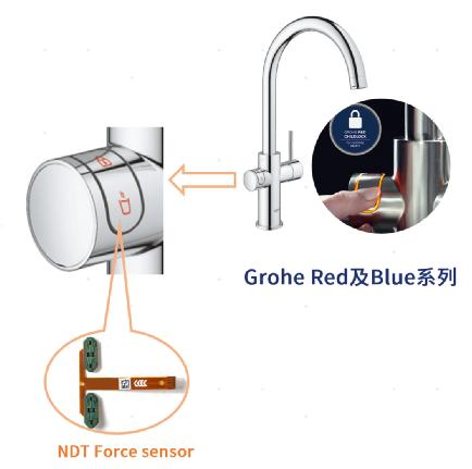 目前,NDT通用型MSK壓感觸控方案已在老板電器的油煙機以及高儀(Grohe)的壓感童鎖開關水龍頭上實現落地應用,廣受消費者好評。其中,高儀壓感童鎖水龍頭方案將NDT MSK壓感模塊貼合于水龍頭開關按鈕的內壁,可有效檢測用戶不同力度的按壓操作,通過壓力分級與長按、短按操作方式的結合實現童鎖開關功能,能夠有效地避免兒童誤觸造成燙傷等問題,同時支持帶水操作以及擁有長久使用壽命。