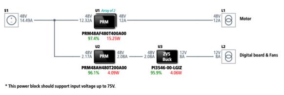 在無人機(jī)的轉(zhuǎn)子側(cè)PDN中,并行配置了兩個(gè)PRM升降壓穩(wěn)壓器(PRM48AF480T400A00),以提供轉(zhuǎn)子所需的12A電流。堆棧中用于數(shù)字控制器電路板的PDN先使用較低功耗的PRM(PRM48AH480T200A00),然后接48V至12V ZVS降壓穩(wěn)壓器(PI3546-00-LGIZ)。