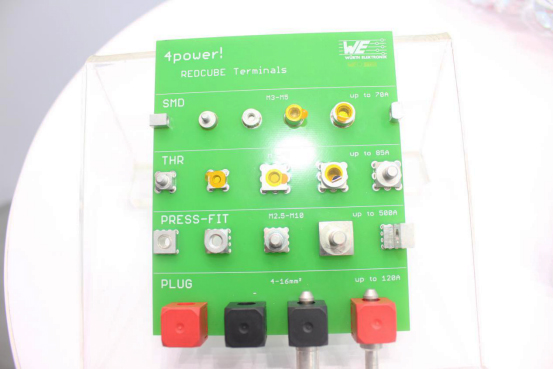 現(xiàn)場(chǎng)伍爾特展示的另一款明星產(chǎn)品就是大電流端子——REDCUBE大電流PCB端子。據(jù)魯克華表示,目前市場(chǎng)上大部分大電流線對(duì)板連接應(yīng)用,很多采用的是銅牌,但是銅牌應(yīng)用于汽車(chē)電子等會(huì)存在一定隱患,比如在生產(chǎn)組裝過(guò)程中,銅牌產(chǎn)生的屑須可能會(huì)造成短路,同時(shí)由于銅牌本身體積較大,當(dāng)電流通過(guò)銅牌時(shí)不一定是平均的,因此產(chǎn)品在使用后會(huì)出現(xiàn)局部發(fā)熱,進(jìn)而對(duì)產(chǎn)品整體使用壽命造成影響,而伍爾特電REDCUBE產(chǎn)品就很好的規(guī)避了上述一些問(wèn)題,其最大電流可通過(guò)500A,該產(chǎn)品目前廣泛應(yīng)用于新能源汽車(chē)、電梯兩大領(lǐng)域。