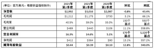 營業利潤同比增長358.8%,達到4.89億美元,而去年同期為1.06億美元。公司的營業利潤率同比增長1120個基點,占凈營收的16.3%;而2020年第二季度為5.1%。