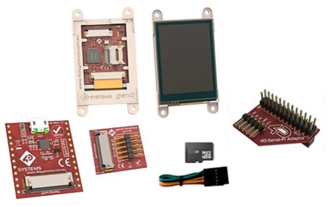 gen4-uLCD-43DCT-PI 的 4 D Systems 入門套件可與 4D 編程電纜、uUSB-PA5-II 和 4D Arduino 適配器 Shield-II 配合使用。 其他附件的套件中提供 gen4-PA、gen4-IB 和 4D 串行 Pi 適配器。