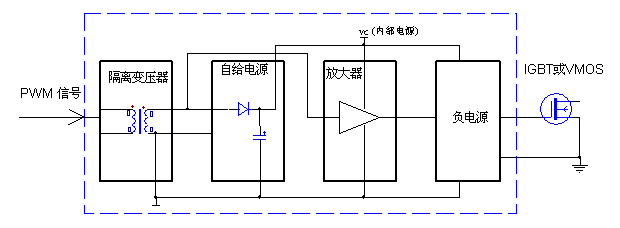可驅(qū)動大功率VMOS 或IGBT一到兩只(并聯(lián))。適用的器件,封裝大致為TO-3P、TO-247,電流容量范圍為20-60A,電壓容量范圍為400-1700V,柵源電容Cgs范圍為4.7-15nF。