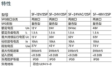 SF-**V/2SP 系列標(biāo)稱放電電流可達(dá) 10000 A,額定負(fù)載電流不得超過0.5安培,采用兩級(jí)串聯(lián)式,反應(yīng)時(shí)間皮秒級(jí),可以充分保護(hù)采用最新半導(dǎo)體器件的設(shè)備。