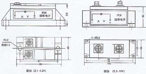 本公司可根據用戶需求設計特殊規格不同范圍壓降或不同外型的模塊。說明:(圖2為2.1-4.2V外形尺寸,圖3為5.3-10V外形尺寸。