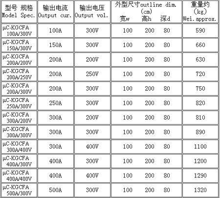 規格明細表:注:手動控制型號為KGCFA,其余同上:單回路直流輸出功率>115KW,變壓器柜外安裝。
