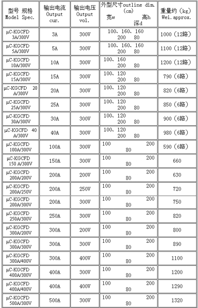 規(guī)格明細(xì)表:注:手動(dòng)控制型號(hào)為KGCFD,其余同上;單回路直流輸出功率>115KW,變壓器柜外安裝。