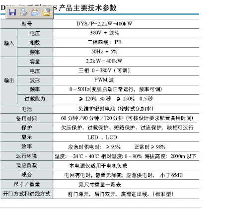 消防)應急電源EP產(chǎn)品名稱:WY系列 產(chǎn)品類別:UPS不間斷電源 >> (消防)應急電源EPS 產(chǎn)品編號:EPS-WY系列 詳細信息:型號 WY1K WY2K WY3K WY5K WY7K WY10K 輸入 電壓 單相220V±25% 三相380V±25%/單相220V±25% 頻率 50Hz±5% 輸出 電壓 正常時:同市電電壓  應急時:220VAC±3% 頻率 正常時:與市電同步  應急時:50Hz±0.5% 波形 正弦波 電池 電池形式 密封式免加水 標稱電壓 48VDC 220VDC 充電時間 <20h 切換時間 <0.25s 應急供電時間 90min(可按需而定) 超載能力 120% 60, 150% 5s 保護功能 欠壓、過流、短路保護 噪音(1m距離) 正常時:無噪音  應急時:<50dB 工作環(huán)境 相對溫度 0-90% 環(huán)境溫度 -20℃~40℃ 海拔高度 <2000m 適應負載 適用于各種照明負載 輸出回路(標準型) 3 3 3 3 3 3 型號規(guī)格 電池配置 應急時間 外形尺寸 重量 輸出回路 安裝 WY1KW 38AH*4 56 560*215*800 80 3 嵌式 掛式 落地式 65AH*4 100 560*215*1200 130 WY2KW 38AH*8 85 600*215*1200 215 3 100AH*4 100 6000*215*1500 230 WY3KW 24AH*8 70 700*215*1200 240 3 落地式 38AH*18 110 750*400*1200 360 WY5KW 38AH*18 65 750*400*1600 410 3 65AH*18 110 750*400*1750 590 WY7KW 65AH*18 75 750*400*1850 650 3 100AH*18 120 750*400*1850 900 WY10KW 100AH*18 90 600*600*2200 960 3 65AH*36 116 800*600*1200 1200 S >> WY系列,WYS系列,產(chǎn)品名稱:WYS系列 產(chǎn)品類別:UPS不間斷電源 >> (消防)應急電源EPS 產(chǎn)品編號:EPS系列 -- WYS系列 詳細信息:型號 WY1K WY2K WY3K WY5K WY7K WY10K 輸入 電壓 單相220V±25% 三相380V±25%/單相220V±25% 頻率 50Hz±5% 輸出 電壓 正常時:同市電電壓  應急時:220VAC±3% 頻率 正常時:與市電同步  應急時:50Hz±0.5% 波形 正弦波 電池 電池形式 密封式免加水 標稱電壓 48VDC 220VDC 充電時間 <20h 切換時間 <0.25s 應急供電時間 90min(可按需而定) 超載能力 120% 60, 150% 5s 保護功能 欠壓、過流、短路保護 噪音(1m距離) 正常時:無噪音  應急時:<50dB 工作環(huán)境 相對溫度 0-90% 環(huán)境溫度 -20℃~40℃ 海拔高度 <2000m 適應負載 適用于各種照明負載 輸出回路(標準型) 3 3 3 3 3 3 型號規(guī)格 電池配置 應急時間 外形尺寸 重量 輸出回路 安裝 WY1KW 38AH*4 56 560*215*800 80 3 嵌式 掛式 落地式 65AH*4 100 560*215*1200 130 WY2KW 38AH*8 85 600*215*1200 215 3 100AH*4 100 6000*215*1500 230 WY3KW 24AH*8 70 700*215*1200 240 3 落地式 38AH*18 110 750*400*1200 360 WY5KW 38AH*18 65 750*400*1600 410 3 65AH*18 110 750*400*1750 590 WY7KW 65AH*18 75 750*400*1850 650 3 100AH*18 120 750*400*1850 900 WY10KW 100AH*18 90 600*600*2200 960 3 65AH*36 116 800*600*1200 1200