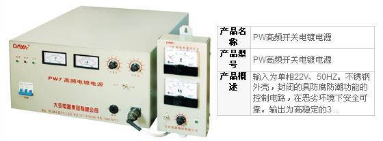 中國大亞電器廠生產的PW/KG系列高頻開關電鍍電源價格優惠,保證質量。可用于鍍金、銀、鎘、銅、鋅、等不同材料的鍍液中。各方面與傳統整流器相比有著獨特的特點:(1)電源體積小,重量輕,效率高,控制精度高。(2)輸出電流為方波高頻脈沖電流,增加電鍍的速率。并且增進死角部位的電流強度,使被鍍物件每個部位的鍍層均勻度一致,大大提高客戶使用靈活性,并有遠程操作功能。(4)保護功能齊全,輸入過壓保護,輸出過熱,過流保護,并有報警功能。(5)功率因數高,對電網污染小,無干擾。(6)采用了防鹽霧酸化的措施,增加電源在惡劣環境下的使用壽命。