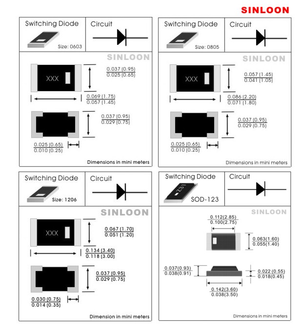 貼片型二極管1206的尺寸與Mini MELF 相差不多(厚度除外),在PC 板 Layout 上完全兼容,不需更改定型后的線路.0805和 Mini MELF 則有些不同,銅箔需加大一點(可參考規格參數資料),而其尺寸大小與貼片電阻及貼片電容完全相同, PC板的設計更加美觀,在自動化貼片機的使用下可同時使用同一部機操作,生產更為方便.