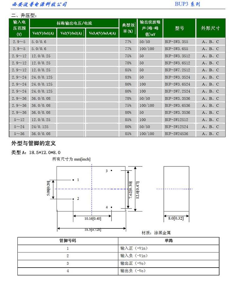 外形尺寸:18.5ⅹ12.0ⅹ8.0/20.0ⅹ20ⅹ4.16/30.0*20.0*7.0(mm) 4:1輸入電壓范圍,單、雙路輸出 典型效率(5v)82% 500kHz開關頻率