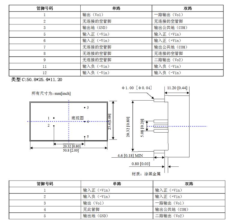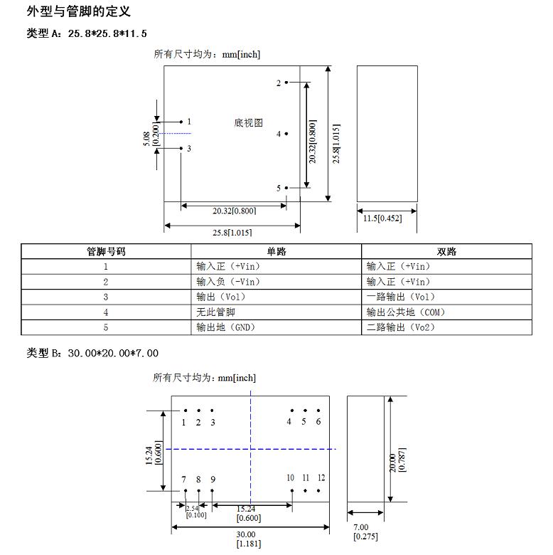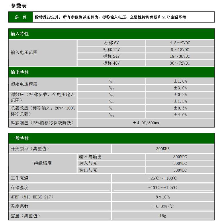 外形尺寸:25.8*25.8*11.5 / 30.00*20.00*7.00 / 50.8*25.4*11.20 2:1輸入電壓范圍,單、雙路輸出 典型效率(5v)70% 300khz開關頻率