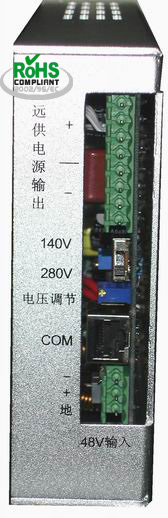 其中,集中式遠(yuǎn)供電源GPHSD-28采用標(biāo)準(zhǔn)19英寸結(jié)構(gòu),可以安裝在通信機柜內(nèi),采用-48VDC集中供電。一個機框可以獨立安裝8個遠(yuǎn)供電源模塊,便于配置和擴容。每個遠(yuǎn)供電源模塊輸出280V直流電源,采用2~6對電話線,可以對一個基站實現(xiàn)遠(yuǎn)程供電。供電距離視基站耗電功率、線對數(shù)量和線徑確定,一般情況下,可以達到0~5 公里。