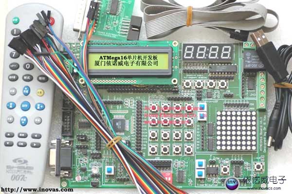 實(shí)驗(yàn)板上布局合理地設(shè)計有23個功能模塊,通過輸入/輸出端口可以快速地與ATMEGA16連接,使用者可以根據(jù)自己編寫的程序做各種實(shí)驗(yàn)。