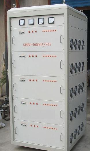 | 應用領域:    產品用途 電極箔生產以水、電為主要生產能源,電力成本占總成本的20%。本公司生產的開關電源是利用高頻技術使電源小型化、輕便化,另外開關電源的發展與應用在節約能源(與傳統可控硅電源相比可節約原50%的電力)、高穩定性(提高腐蝕箔孔徑精確度的)及保護環境方面都具有重要的意義。宜昌某鋁箔行業巨頭在2004年建廠投產短短的兩年多時間內取得湖北省高新技術企業證書,而且采用本公司供應的  15V3500A/6V6000A腐蝕用電源,600V1000A/600V500A化成用電源后,大大降低生產成本(每年可節約200萬元左右電費)同時提高產品質量(24小時連續工作產品質量沒有出現問題)。SPWM系列電源電能效率高(90%以上),體積小,價格便宜,可長時間穩定工作電源。     產品指標參數: 電壓:0-6V,0-15V,0-600V(10000V) 平均電流:0-500A,0-1000A,3500A,6000A ,15000A,20000A 輸入電壓:單相AC 220V±15% 50HZ                    三相 AC 380V±15% 50HZ 輸出最大電壓:0-10000V  輸出最大電流:0-20000A 輸出最大功率:1000KVA 電壓調整率:<1% 負載調整率:<1% 紋波:<3%(特殊要求紋波可小于1%) 功率因數:>95% 整機效率:>85% 具有自動恒壓、恒流、過流、過壓、欠壓、缺相、超溫等保護功能; 特點: l          體積小,重量輕,只是同規格可控硅整流器的20% l          效率高,節能效果顯著。比可控硅整流器節能20~30% l          功率因數高,對電網污染小。 l          輸出電壓、電流獨立可調,恒壓、恒流自動轉換。 l          PLC接口功能:可遠程控制電源輸出。 l         告警功能:具有電流告警、短路告警功能。 |
