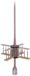 |      避雷針的中央收集桿和激發器之間的電場能量迅速提升而造成尖端產生的空氣離子化,可于極短及準確的時間內放電,因大量電離子的存在,從而使自然的Corona效應減低,產生一預期上行放電通道,可迅速、安全地將雷電截擊及安全地泄方到大地。  |