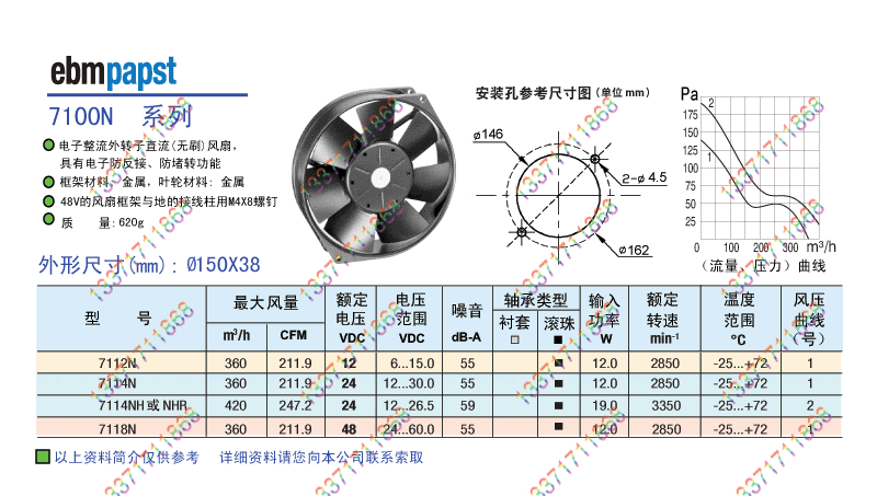 供應(工程尾貨)德國 ebmpapst 7114NH或NHR,DC24V/790mA鐵扇葉軸流風扇,外形尺寸:Φ150X38(mm)