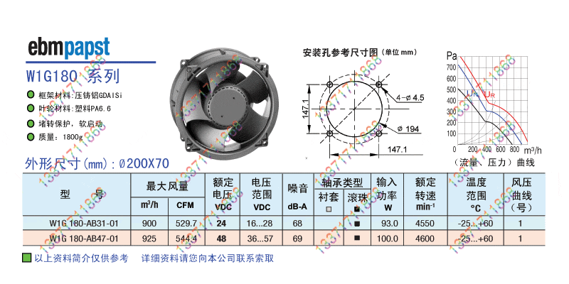 供應(yīng)(工程尾貨)德國(guó) ebmpapst W1G180系列24V直流軸流風(fēng)扇,外形尺寸:Φ200X70(mm)
