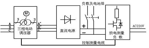 如圖所示,測量連接時需斷開直流電源與電池組和負載的連接,三相交流電源接調壓裝置的輸入,三相調壓器的輸出接直流電源的輸入。直流電源的輸出接接放電測量負載的輸入(注意正負極性,不要接反)。連接放電測量負載與三相調壓裝置的控制測量電纜。同時放電測量負載接入工作電源AC220V。