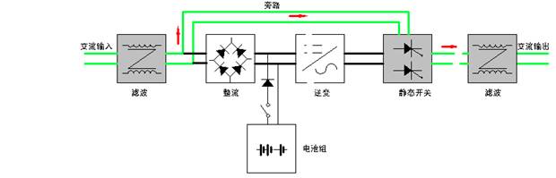 圖2 逆變系統工作于旁路狀態時各部份電路之運作方法