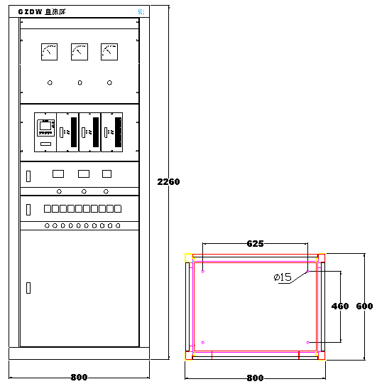 1. 高頻開關(guān)直流電源柜的外形尺寸為:2260×800×600(高×寬×深),機(jī)柜前門采用鋼化玻璃門,后門采用鋼結(jié)構(gòu)對開門。安裝人員應(yīng)依工程設(shè)計(jì)圖,在確保便于維護(hù)和足夠的行人通道等前提下,合理規(guī)劃安裝位置。