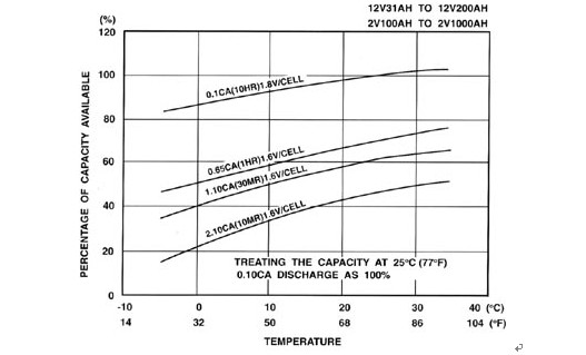 | 2)溫度的影響溫度對電池容量有顯著的影響,溫度降低,電池容量下降,請參考曲線圖。