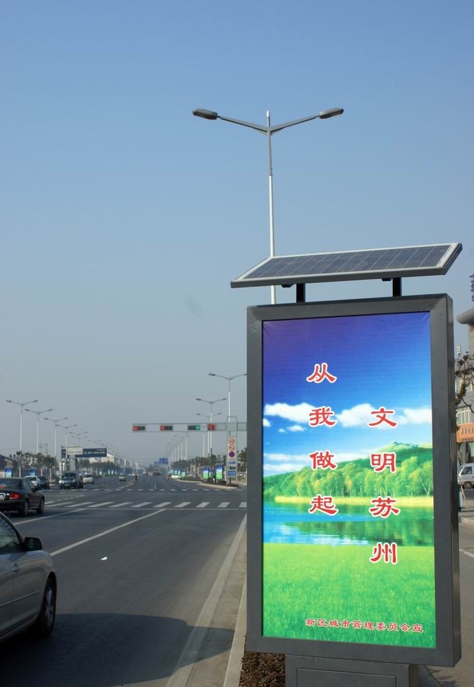 通過(guò)太陽(yáng)能轉(zhuǎn)化成電能進(jìn)行供電,自成供電體系。因此,可廣泛應(yīng)用在道路、機(jī)場(chǎng)、廣場(chǎng)、社區(qū)、公園等地方,可以制作成交通標(biāo)志牌、公交站牌、小區(qū)樓宇指示牌、公共信息標(biāo)識(shí)、戶外廣告燈箱等產(chǎn)品。