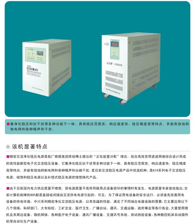 河南音響穩(wěn)壓器JJW/JSW隔離消噪音純在線河南中川總部JJW/JSW/SJW系列產(chǎn)品全部采用三星分別調(diào)壓,隔離加強型、隔離凈化型、普通凈化型、具有三相電壓自動平穩(wěn)衡功能;2.穩(wěn)壓范圍均為三相380V±20%(304V-456V),單相220V±20%(176V-264V)如需更寬穩(wěn)壓范圍可根據(jù)用戶要求制作;穩(wěn)壓精度±2。3.輸出電壓電流顯示為LCD液晶顯示,同調(diào)和分調(diào)任意設(shè)置,可以設(shè)置穩(wěn)壓故障不間斷轉(zhuǎn)市電。4.該產(chǎn)品具備CE SONCAP廣電入網(wǎng)認(rèn)證,變壓器采用全銅線制作,含銅量99.94%,一個專業(yè)、專注、專長服務(wù)于一體的鄭州宏瑞德電氣設(shè)備有限公司宏瑞德電氣設(shè)備有限公司在國內(nèi)電源產(chǎn)品及技術(shù)解決方案等領(lǐng)域占據(jù)領(lǐng)先地位,公司產(chǎn)品已達(dá)到國內(nèi)、國際同類產(chǎn)品的領(lǐng)先水平。宏瑞德公司與美國知名的電源廠商合作研發(fā)生產(chǎn)的大型EPS/UPS,單機最大容量800KVA,輸出功率因素0.9,具備自老化功能,市電同步采用快切方式供電,大大提高電子元件使用壽命,同時可實現(xiàn)6臺UPS冗余并機。實現(xiàn)了用戶效益最大化,填補了國內(nèi)大型高端EPS/UPS的空缺。