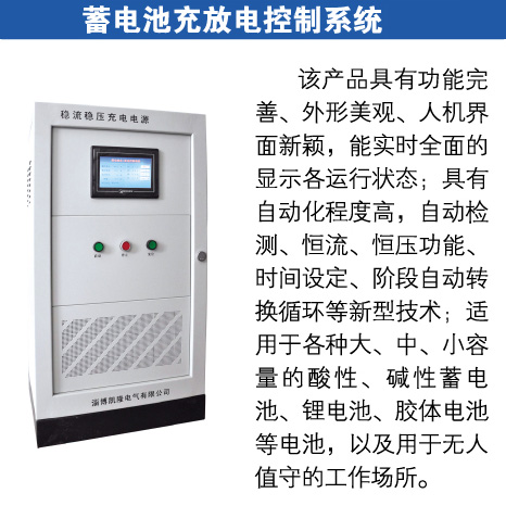 本系列產品具有功能完善、外形美觀、人機界面新穎,能實時全面的顯示各運行狀態、功率因數高、節能等特點;自動化程度高,將自動檢測、恒流、恒壓功能、時間設定、階段自動轉換循環等技術融于整個充放電過程;充放電方式科學合理,規格品種齊全,分臺式、立式二種;是廣大用戶理想的選擇。適用于各種大、中、小容量的酸性、堿性蓄電池、膠體電池的化成、充放電等,以及用于無人值守的電源工作場所。