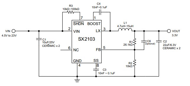 SX2103是一款單片同步整流降壓穩(wěn)壓器,它集成了導(dǎo)通阻抗130毫歐的MOSFET,可以很寬的輸入電壓范圍(4.75V-23V)內(nèi)提供3A的負(fù)載能力。電流模式控制使其具有很好的瞬態(tài)響應(yīng)和單周期內(nèi)的限流功能。可調(diào)的軟啟動(dòng)時(shí)間能避免開(kāi)啟瞬間的沖擊電流,在待機(jī)模式下,輸入電流小于1uA。SX2103封裝為SOP-8, 同時(shí)提供了緊湊的系統(tǒng)方案,可以最大限度的減少外圍元件。