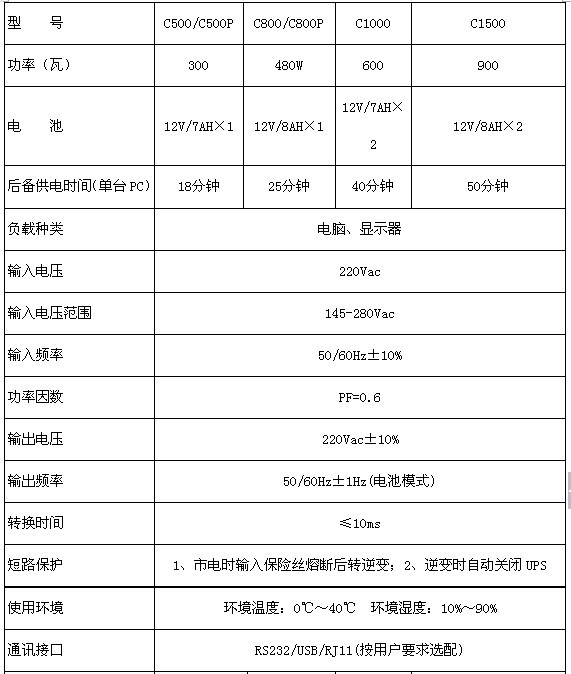適用于電腦ups電源C系列的各個型號技術參數: