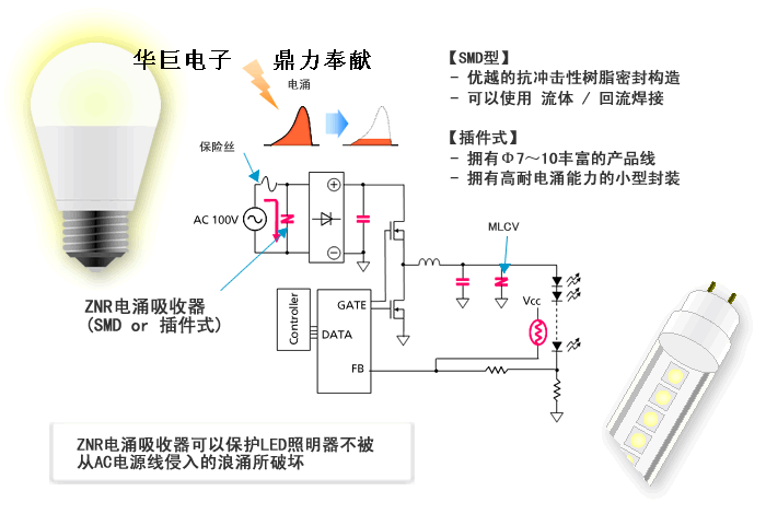 隨著LED顆粒成本的不斷降低,越來(lái)越多的LED燈具走入尋常百姓家,但是工頻用電網(wǎng)絡(luò)難免受到雷電及工業(yè)大功率器件啟動(dòng)和停止的影響,是的供電網(wǎng)絡(luò)電壓波動(dòng),從而引起LED的損壞,嚴(yán)重影響LED的使用壽命。使用華巨電子生產(chǎn)的具有過(guò)壓保護(hù)功能的壓敏電阻將是一個(gè)很好地低成本解決方案,華巨電子以其在壓敏電阻保護(hù)領(lǐng)域的經(jīng)驗(yàn)推薦客戶選用我的壓敏電阻作為L(zhǎng)ED浪涌防護(hù),防止LED被AC輸入端侵入的浪涌電流所破壞,考慮到現(xiàn)在LED燈具照明體積越來(lái)越小,越來(lái)越扁平化,華巨電子適時(shí)推出適合專門應(yīng)用于LED照明的大尺寸貼片壓敏電阻。