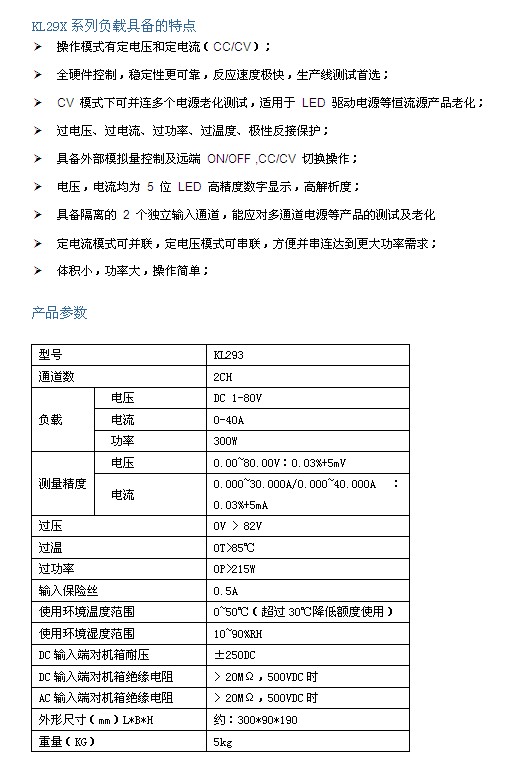 雙道電子負(fù)載KL293 80V40A300W產(chǎn)品詳情
