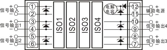 ● 精度等級:0.1級、0.2級、0.5級 ● 產品出廠前已檢驗校正,用戶可以直接使用 ● 全量程內非線性度<0.2%,免零點和增益調節 ● 信號輸入/輸出1/輸出2/輸出3/輸出4/電源之間 六隔離 ● 輔助電源:5VDC,12VDC,24VDC單電源供電 ● 四路輸出可為一致或分別不同的直流電壓和電流信號 ● 0-75mV//0-5V/0-±100mV/0-±10V等電壓信號與 0-10mA/0-±20mA/4-20mA等電流信號間隔離、放大轉換 ● 工業級溫度范圍: - 25℃ ~ + 70℃ |