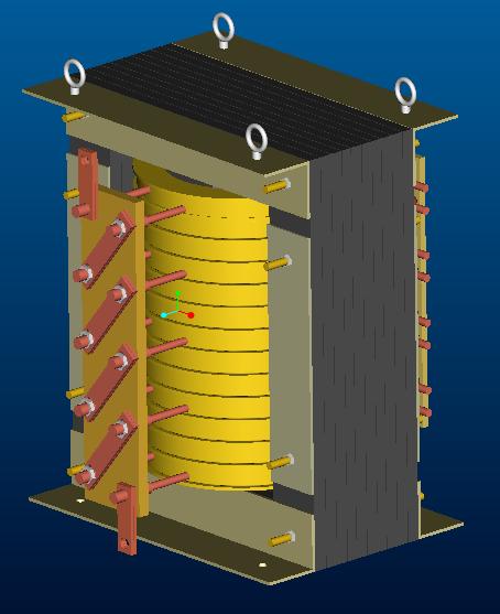 本變壓器的鐵芯是采用Mn-Zn2000B高飽和鐵氧體塊疊裝而成,初級線圈共計8個線圈每個線圈4匝,總數(shù)為32匝,次級線圈并成兩個線圈,每個線圈兩匝,串聯(lián)時次級可為4匝。初次級線圈繞組為水內(nèi)冷。因此本產(chǎn)品冷卻效果良好鐵耗和銅耗較少,效率高。