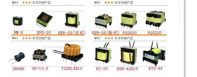 主要產品:液晶LCD變壓器、AC-DC變壓器、閃光燈變壓器、開關式電源變壓器、高頻焊機逆變變壓器、UPS變壓器、驅動變壓器、通迅器材專用變壓器、PFC功率因素變壓器、濾波器、立式電感、可調電感、色碼電感、觸發線圈、環形線圈以及空芯線圈等。