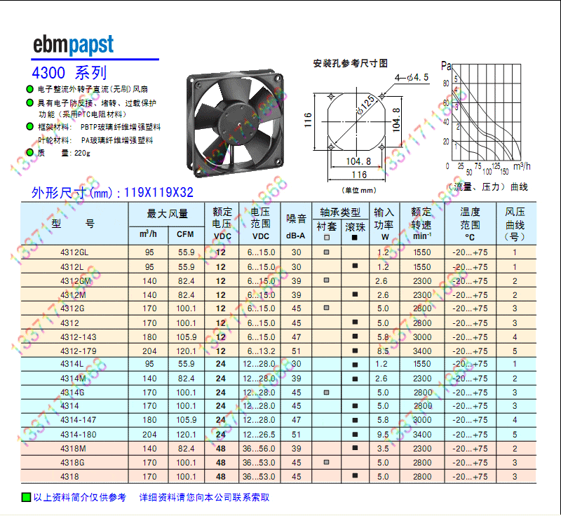供應(工程尾貨)德國ebmpapst 4314直流軸流風扇 DC24V 外形尺寸:119X119X32(mm)